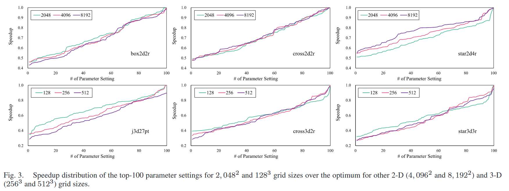 在 2-D 模板中,小尺寸下的最佳设置在大尺寸下依然能达到 1 倍的加速比(即依然是最优)。在 3-D 模板中,其表现也能达到最优值的 0.94 倍至 1 倍 。