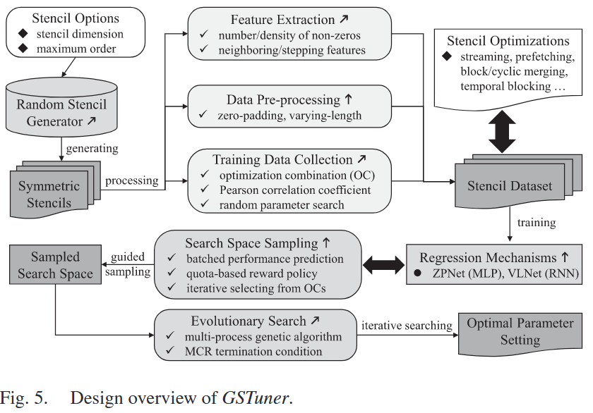 以往工作(如 StencilMART)使用卷积神经网络(CNN)直接预测最佳优化组合(OC),但这种“激进修剪”容易漏掉被低性能参数包围的全局最优解 。GSTuner 使用回归算法预测具体参数设置的执行时间,以此引导搜索空间的采样过程,确保了探索的深度和广度 。