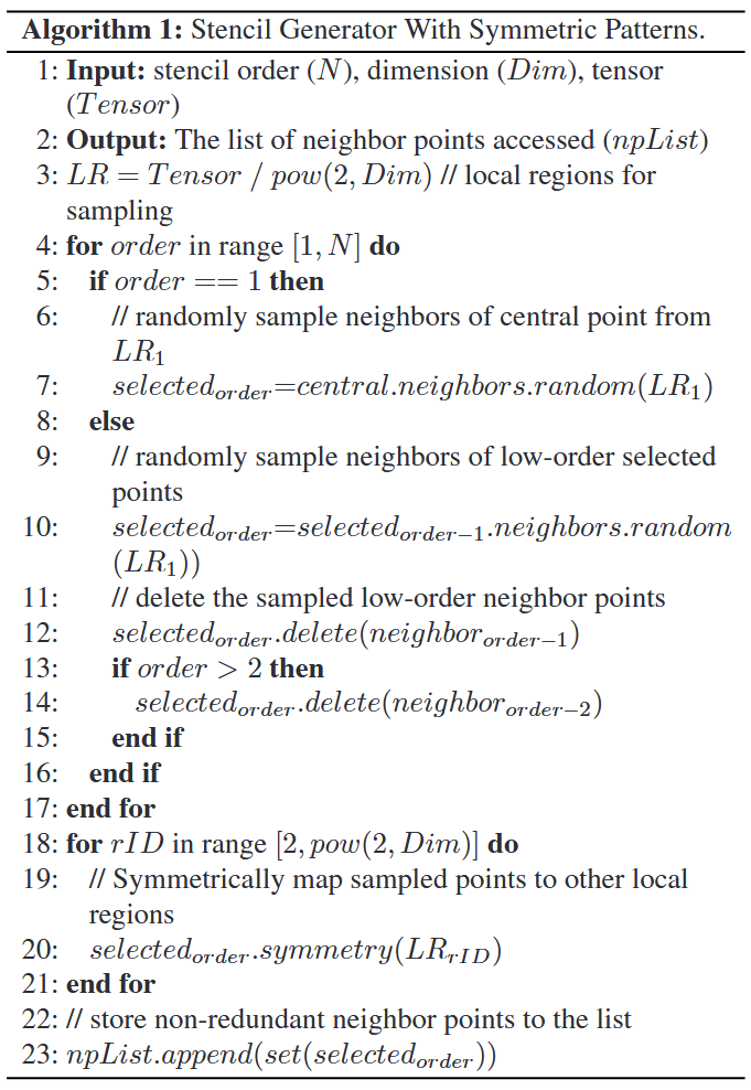 随机模板生成器(Random Stencil Generator ):根据输入的模板维度和最大阶数,生成多种具有对称访问模式的随机模板程序,用于收集训练数据集 。