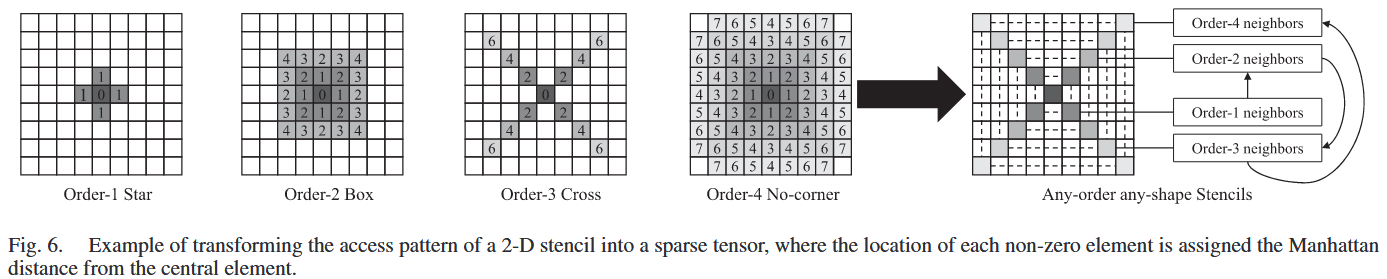 任何维度的模板访问模式都被表示为一个稀疏张量 。物理意义:张量中的索引代表了邻居点相对于中心点的偏移量 。