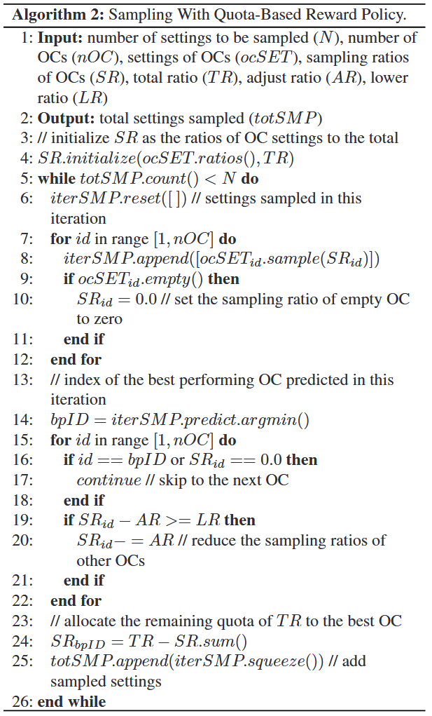 功能:设计了一种基于配额的奖励政策 (Quota-based Reward Policy),从高性能的优化组合(OCs)中筛选参数设置 。